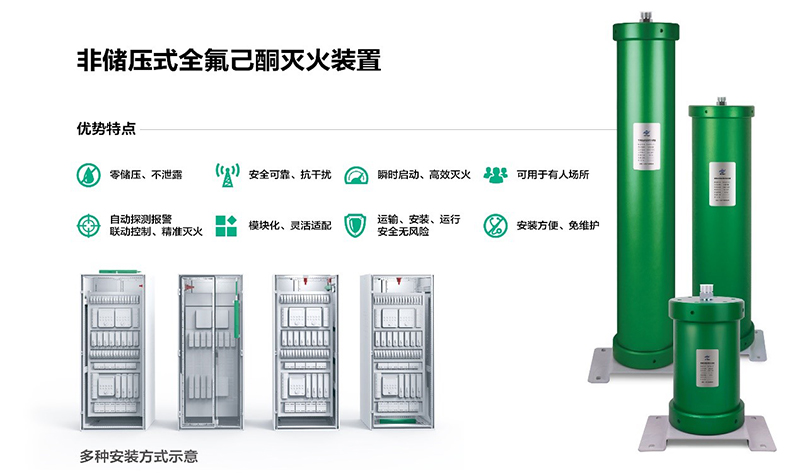 非储压设计使装置常温无压储存,无需定期压力检测,降低运维成本;同时全氟己酮 ODP(臭氧消耗潜能值)为 0、GWP(全球变暖潜能值)仅 1,完全符合环保标准,且绝缘性能优异,在 110kV 电压下呈现高绝缘性,适用于配电柜、电池箱等精密电气设备防护,能够实现 “灭火无残留、防护无损伤”。